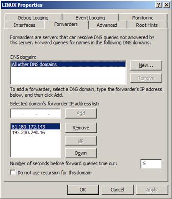 Dati clic pe eticheta Forwarders. Bifati optiunea Enable Forwarders. in caseta "Selected domain's forwarder IP address list" introduceti adresele IP ale server-elor DNS catre cre vreti sa inaintati cererile,in mod tipic serverul al furnizorului de servicii Internet. Puteti adauga mai multe servere. Cel mai sus din lista face prima data cererea si daca nu raspunde intr-o anumita perioada de timp, cererea va fi inaintata urmatorului server din lista.
