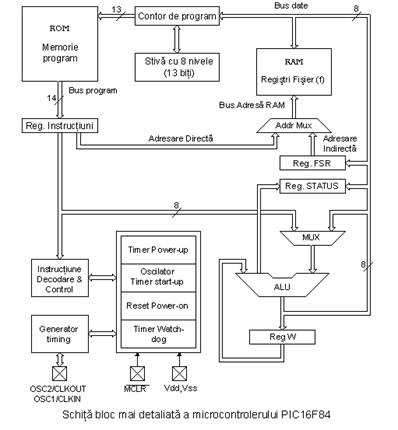 Liniile subtiri ce merg din interior catre partile microcontrlerului reprezinta fire conectând blocurile interioare cu pinii capsulei microcontrolerului. Schema urmatoare reprezinta sectiunea centrala a microcontrolerului.
