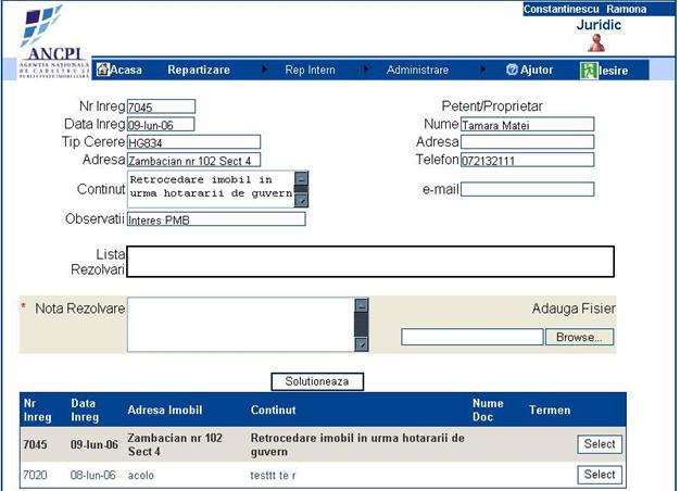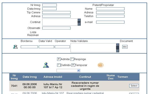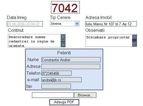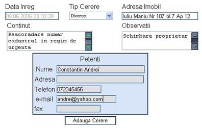 Dupa apasarea butonului de inregistrare va aparea o interfata in care vor putea fi completate uramtoarele campuri: tip_cerere, adresa imobil, continut, observatii si o caseta in care se vor completa date despre proprietar sau petent dupa caz pentru a putea fi contactat in cazul rezolvarii lucrarii sau experierii acesteia prin posta.