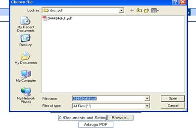 Folosind butonul de Upload se va incarca fisierul corespunzator cererii tocmai scanate. Urmatorul pas va fi adaugarea acestui fisier in baza de date de mentionat ca se va adauga doar numele acestuia ce va fi compus din nr de inregistrare + data inregistrarii+cod user ia fisierul propriuzis va fi salvat pe server intrun director numit date_doc.