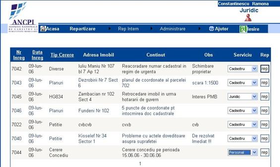 In pagina Repatizare->Lucrari va aparea un data grid in care vor fi toate lucrarile inregistrate in Registratura si asteapta sa fie repartizate. Pe langa operatiunea de repartizare pe servicii Managerul va avea posibilitatea de a stabili termenul de rezolvare al unei lucrari. Repartizarea se va face selectand din combo-ul din fiecare linie a data grid-ului numele serviciului catre care va fi repartizata lucrarea.