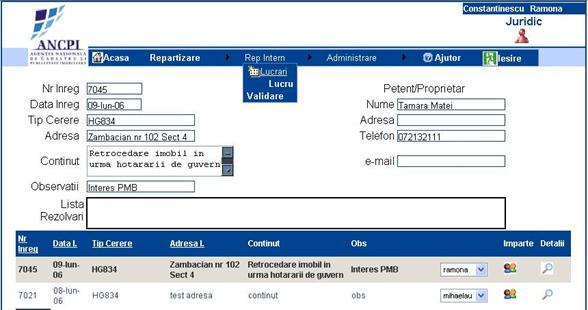 Interfata de solutionare a dosarelor poate fi accesata de catre toti operatorii indiferent de nivelul de securitate de care apartine acesta. Accessul al acest view se face acesand Itemul Lucru al meniului Rep Intern.