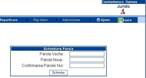 In meniu este disponibila si o optiune de administrare prin intermediul careia ficare operator isi poate modifica parola. Este necesar ca userul sa stie vechia parola ca masura de precautie in cazul in care intra o persoana neautorizata si vrea sa modific parola. Deasemenea parola noua cere o confirmare pentru nu grsi la introducerea noii parole. Modifcarea parolei se face pentru userul de oracle si devine totodata si parola userului aplicatiei. Metoda care face modificarea parolei este:
