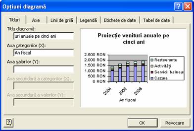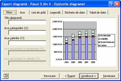Diagramele sunt utile pentru afisarea datelor statistice într-o maniera atractiva. Un titlu sau etichete semnificative pot clarifica întelesul diagramei si îi pot spori impactul. Când creati o diagrama utilizând Expertul diagrama, la diagrama sunt adaugate etichete de categorie si o legenda, daca zona de celule selectata include informatiile necesare. De asemenea, aveti posibilitatea sa adaugati titlu si etichete de axa pe parcursul operatiei expert, sau aveti posibilitatea sa le adaugati mai târziu prin modificarea optiunilor diagramei.