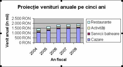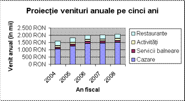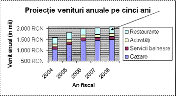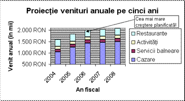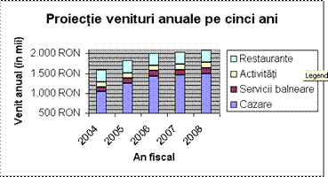 Managerul de vânzari de la Adventure Works a aflat ca în urma noilor campanii de marketing se asteapta o crestere cu 50 % a veniturilor din restaurante, iar pentru venituri din activitatea balneara o crestere cu 60 %. Când se vor introduce noile cifre în foaia Proiectii vânzari, diagrama Proiectii venituri pe cinci ani se modifica pentru a reflecta noile date.