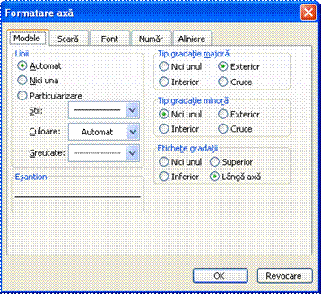Pe masura ce se modifica valorile datelor, poate fi necesar sa se modifice si diversele aspecte ale axelor din diagrama. Utilizând optiunile Scala, aveti posibilitatea sa formatati Axa valorii (axa Y) pentru a afisa o zona semnificativa de valori pentru date. Optiunile Scala pentru Axele categoriei va permit sa controlati afisarea etichetelor de categorie.
