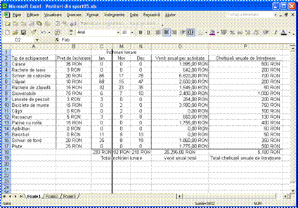Exercitiul 1: Deschideti registrul de lucru Venituri din sport05.xls. Mariti Foaie1cu 50% si micsorati cu 100%. Ascundeti si reafisati coloana B. Înghetati coloana B si rândul 3, apoi anulati înghetarea.