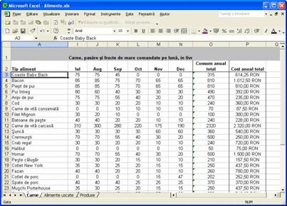 Exercitiul 2: Deschideti registrul de lucru Alimente.xls. În foaia de lucru Rezumat, scrieti o formula care însumeaza cantitatea totala comandata de carne, pui si fructe de mare. Deschideti registrul de lucru Buget.xls si creati o formula în prima foaie de lucru, care însumeaza costul tuturor produselor comandate.