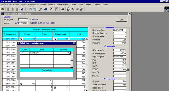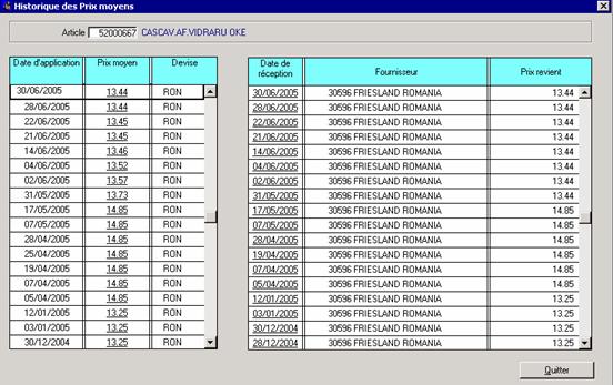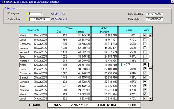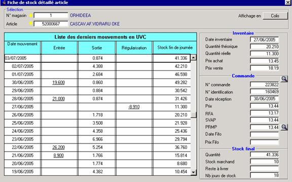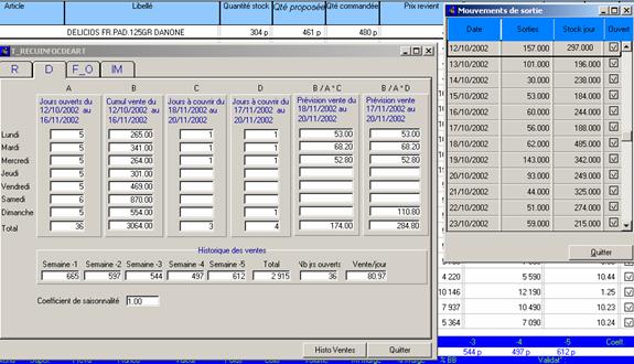 Clicand cu mouse-ul pe butonul « Histo Ventes » se poate vedea detaliul zilnic al ultimelor 5 saptamani in ceea ce priveste vanzarile si stocul teoretic.