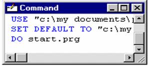 Fereastra de comanda (Command) interactioneaza direct cu sistemul. În ea se poate scrie orice fel de comanda specifica Visual FoxPro. O instructiune introdusa în fereastra Command ramâne acolo pâna la parasirea mediului. Prin deplasarea cu ajutorul tastelor directionale se poate alege comanda anterioara tastata.
