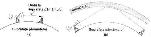 Oricum, undele care ating ionosfera, un strat de particule care învelesc atmosfera la o înaltime de 100 pâna la 500 Km, sunt refractate de aceasta si trimise înapoi spre pamânt, dupa cum arata Fig, 2-12(b). In anumite conditii atmosferice, semnalele pot parcurge acest drum de mai multe ori.