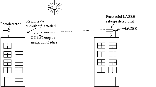 Un dezavantaj este ca fascicolul laser nu penetreaza ploaia si ceata groasa, dar în mod normal ele functioneaza bine în zilele însorite. Oricum, autorul a participat odata într-un hotel modern din Europa la o conferinta la care organizatorii conferintei s-au gândit sa puna la dispozitie o camera plina cu terminale, în care participantii sa-si poala citi posta electronica în timpul prezentarii plictisitoare. Deoarece PTT-ul local nu dorea sa instaleze un numar mare de linii telefonice pentru 3 zile, organizatorii au montat pe acoperis un laser orientat catre cladirea departamentului de calculatoare al universitatii de calculatoare aliata la o distanta de câtiva kilometri. Ei 1-au testat cu o noapte înainte si totul a decurs perfect. La ora 9, dimineata urmatoare, într-o zi însorita, legatura cazut si a ramas asa toata ziua. Seara, organizatorii au testat-o din nou cu atentie si a functional inca o data perfect. Acelasi lucru s-a întâmplat timp de doua zile consecutiv.