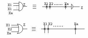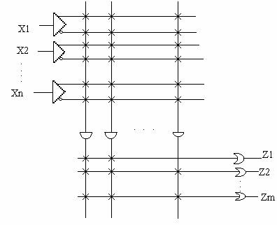 Unde zi=zi(z1,z2,.,zn);i=1,2,.m. Matricile "SI"si"SAU"pot fi programabile sau nu,in functie de tipul SLP. Primul nivel poate fi considerat ce al structurii de interconectare,iar cel de-al doilea,cel al structurii de memorare. In functie de informatia memorate,se realizeaza legaturi intre elementele de interconectare si de elementele logice. Datorita faptului ca SLP contin in structura lor un numar marede porti logice si dispun de un numar mare de intrari,pentru usurina reprezentarii,se utilizeaza conventia simbolistica prezentata in figura.