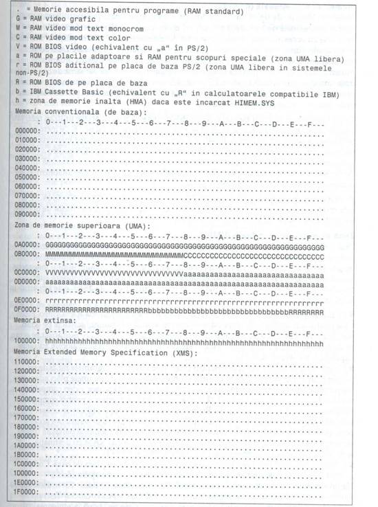 - Ultimii 128K sunt rezervati pentru componenta BIOS de pe placa de baza. Componenta BIOS este incorporata în memoria ROM de pe placa de baza. Tot în acest spatiu se afla autotestul efectuat la punerea sub tensiune (POST- Power-On Self-Test) si încarcatoru1 de sistem (bootstrap loader), care dirijeaza sistemu1 pâna la preluarea controlului de catre sistemu1 de operare DOS. Majoritatea sistemelor utilizeaza doar ultimii 64 K (sau mai putin) din acest spatiu, lasând primii 64 K sau mai mult la dispozitia programelor de gestiune a memoriei, în vederea redistribuirii. Unele sisteme includ în acest spatiu si programul CMOS Setup. Componentei BIOS de pe placa de baza îi sunt alocate adresele cuprinse între E0000 si FFFFF.