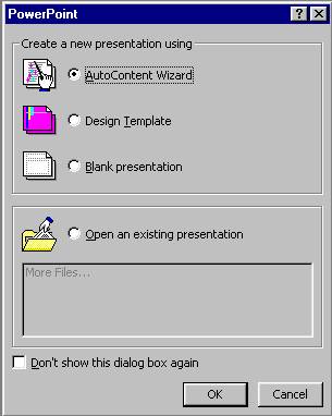 Aceste optiuni pot fi alese din urmatoarea fereastra, care apare in momentul in care alegem sa deschidem PowerPoint (Start->Programs->Microsoft PowerPoint) :