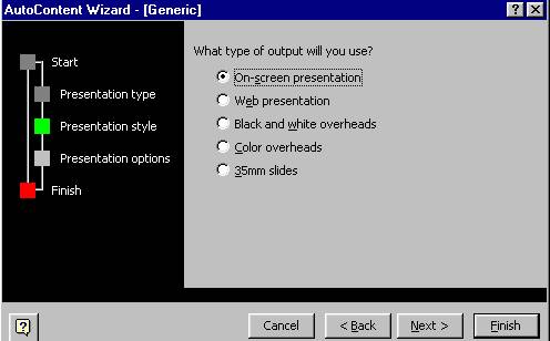 Alegand Next apare urmatorul ecran care va cere sa precizati stilul utilizat pentru prezentare : prezentare pe ecran, prezentare pe Internet, folii alb-negru, folii color sau pe diapozitive de 35 mm :