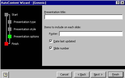 Alegem o optiune si apasam Next. Aceasta are ca efect aparitia ultimei ferestre care solicita introducerea unui titlu pentru prezentare si intreaba ce elemente sa includa in nota de subsol a prezentarii(footer): data, numarul paginii, etc.