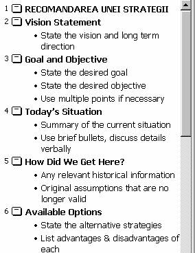 In partea stanga a ecranului apare o fereastra care ne sugereaza structura si ideile care ar trebui sa le contina fiecare pagina din cadrul unei prezentari de acest tip ( vazuta in modul de prezentare Outline):