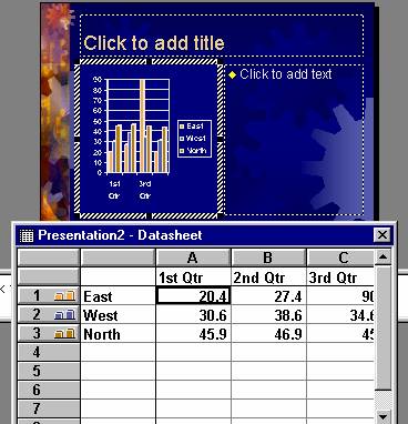 Daca se alege o macheta predefinita ce contine pictograma diagramei, se efectueaza dublu clic pe ea pentru a lansa programul Microsoft Graph. Care afiseaza in tabel exemple de informatii. Este suficient sa introduceti in locul acestora datele necesare si diagrama va fi afisata in spatele tabelului.