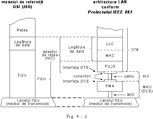 Arhitectura LAN - conform Proiectului IEEE 802 - este reprezentata în fig. 4 - 2 (indicându-se si corespondenta cu primele doua niveluri ale modelului de referinta OSI).