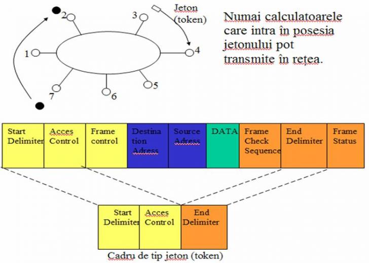 Referindu-ne la reteaua din figura, sa presupunem ca statia 7 doreste sa comunice cu statia 2, deci dupa ce intra īn posesia jetonului, ii adauga datele necesare si repune cadrul pe retea - acesta circula pana ajunge la adresa de destinatie, unde i se modifica cāmpul ,,starea cadrului" pentru a putea comunica sursei faptul ca a primit cadrul. Proceseaza datele ce trebuie procesate si retransmite cadrul pe retea. Acesta circula pana ajunge la statia sursa. īn acest moment, daca statia mai are de transmis, de exemplu mesajul a fost lung si a trebuit sa fie impartit īn mai multe cadre, procesul se repeta. īn cazul cānd a terminat de comunicat, scoate orice informatie din cadru - il transforma īn jeton si il pune pe retea - acum orice alt calculator poate intra īn posesia jetonului, pentr a comunica īn retea. Definitia completa pentru modificarea starii cadrului: Daca respectivul cadru a fost recunoscut si copiat sau daca adresa de destinatie a fost disponibila.