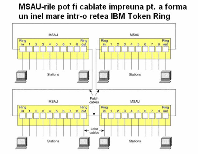 Reteaua Token Ring este cablata īn stea, dar are o topologie logica inel (ring). Se utilizeaza concentratoare de cabluri denumite MSAU (MultiStation Attachment Unit), care asigura functionarea inelului.
