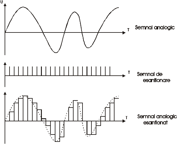 Apare evident ca semnalul reconstituit de fig.8.2.c. va fi mai fidel cu cel din 8.2.a. cu c t frecventa de esantionare va fi mai mare si cu c t se vor folosi mai multi biti pentru reprezentarea numerica a amplitudinii unui esantion.