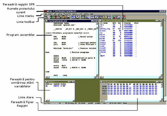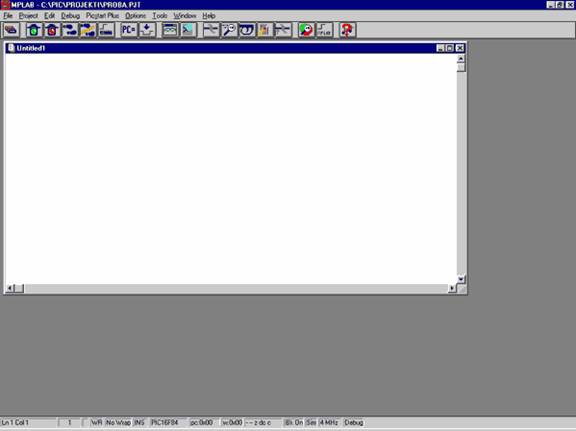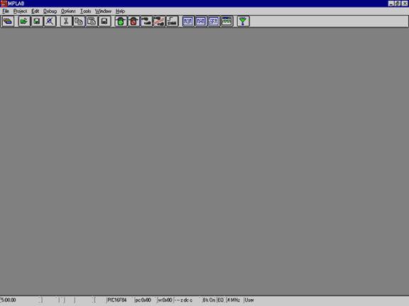 Urmând procedura de instalare, veti obtine un ecran al programului însusi. Dupa cum vedeti, MPLAB arata ca cele mai multe programa Windows. În apropierea zonei de lucru este un "menu" (în partea de sus colorat în albastru cu optiunile File, Edit.etc.), "toolbar" (o zona cu ilustratii de marimea unor patrate mici), si linia de stare în partea de jos a ferestrei. Este o regula în Windows de a lua cele mai frecvent folosite optiuni de programe si de a le plasa mai jos de menu, de asemenea. Astfel le putem accesa mai usor si sa grabim lucrul. Cu alte cuvinte, ceea ce aveti în în toolbar aveti de asemenea în menu.