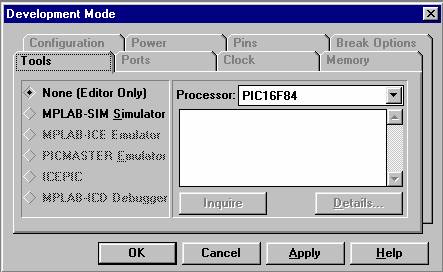 Setarea unui mod dezvoltare este necesara asa ca MPLAB sa poata sti ce instrumente vor fi folosite pentru a executa programul scris. În cazul nostru, avem nevoie sa setam simulatorul ca un instrument ce este folosit. Facând clic pe OPTIONS---> DEVELOPMENT MODE, o noua fereastra apare ca în imaginea de mai jos:
