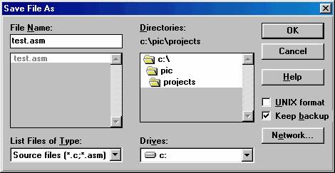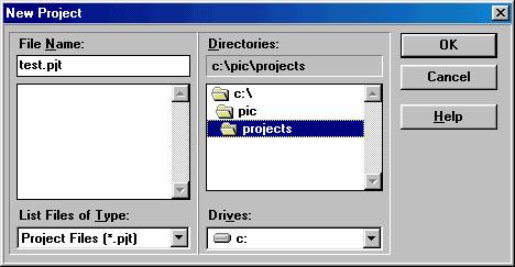 Pentru a începe sa scrieti un program aveti nevoie sa creati mai intâi un proiect. Facând clic pe PROJECT --> NEW PROJECT puteti sa va denumiti proiectul si sa-l memorati într-un director pe care-l doriti. În imaginea de mai jos, este creat un proiect numit 'test.pjt' si memorat în directorul c:\PIC\PROJEKTS\.