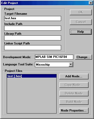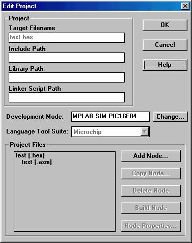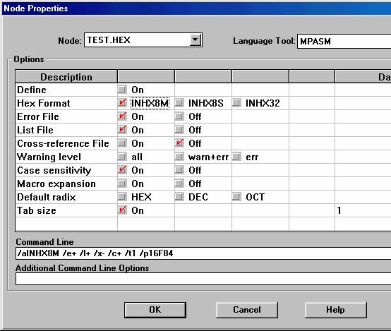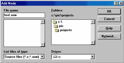 Din aceasta imagine observam ca sunt diferiti parametri. Fiecare fel corespunde la un parametru în "Command line". Pentru ca memorarea acestor parametri este foarte necomfortabila, chiar interzisa pentru începatori, s-a introdus ajustarea grafica. Din imagine observam ce optiuni trebuie deschise. Facând clic pe OK ne întoarcem la fereastra anterioara unde "Add node" este o optiune activa. Facând clic pe ea obtinem urmatoarea fereastra unde ne denumim programul asamblor. Sa-l denumim"Test.asm" pentru ca acesta este primul nostru program în MPLAB.