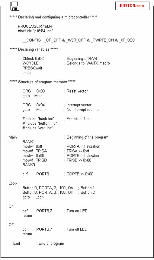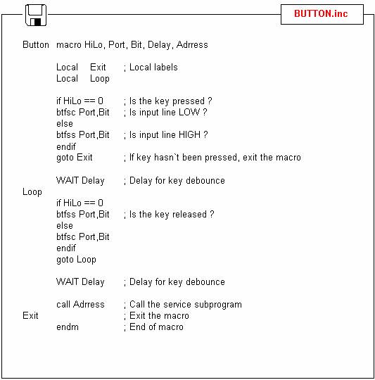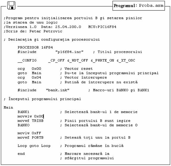 Exemplu de mai sus arata un macro a carui scop este de a înlocui la portul B argumentul ARG1 ce a fost definit în timp ce a fost apelat macro-ul. Folosirea lui în program ar fi limitata la scrierea unei linii: ON_PORTB 0xFF , si astfel am plasa valoarea 0xFF la PORTB. Pentru a folosi un macro în program, este necesar de a include fisierul macro în programul principal cu instructiunea include "macro_name.inc". Continutul unui program este copiat automat într-un loc unde instructiunea este scrisa. Aceasta poate fi cel mai bine vazut într-un fisier lista anteriror unde fisierul cu macro-uri este copiat mai jos de linia #include"bank.inc"