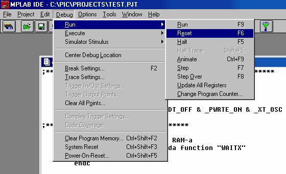 Comanda urmatoare într-un simulator este DEBUG>RUN>STEP care începe pasii nostri prin program. Aceeasi comanda ar fi putut fi desemnata de la o tastatura cu tasta <F7> (în general, toate comenzile importante au taste desemnate de le claviatura). Folosind tasta F7, programul este executat pas cu pas. Când obtinem un macro, fisierul continând un macro este deschis (Bank.inc), si continuam cu macro. Într-o fereastra cu registri SFR putem observa cum registrul W primeste valoarea 0xFF si pe care o trimite la portul B. Facând clic pe tasta F7 din nou, nu obtinem nimic pentru ca programul a ajuns într-o "infinite loop"-bucla infinita. Bucla infinita este un termen pe care îl întâlnim adesea. Reprezinta bucla din care un microcontroler nu poate iesi pâna nu se întâmpla întreruperea (daca este folosita într-un program), sau pana ce micorcontrolerul va fi resetat.