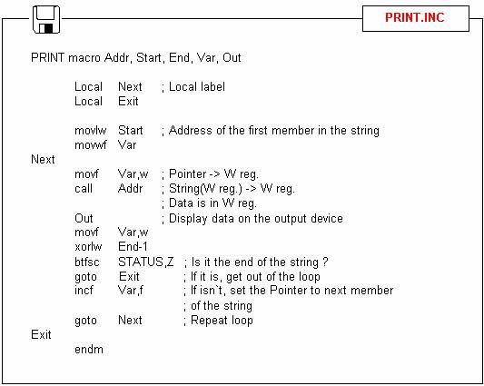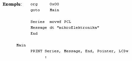 Macroul PRINT este localizat în fisierul Print.inc. El usureaza lucrul pentru trimiterea unui sir de date la unul dintre dispozitivele de iesire, cum ar fi: LCD, RS232, imprimanta matriciala...etc. Cea mai usoara cale pentru a forma o serie este prin folosirea unei directive dt (define table). Aceasta instructiune memoreaza o serie de date în cadrul memoriei programului ca un grup de instructiuni retlw al carui operand este data din sir.