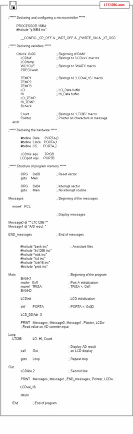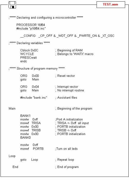 Programul trebuie sa fie scris într-o fereastra care este deschisa, sau copiata de pe un disc, sau luat din prezentarea Mikroelektronika Internet folosind optiunile copy si paste. Când programul este copiat în &q 14414r1723o uot;test.asm" window, putem folosi comanda PROJECT -> BUILD ALL (daca nu sunt erori), si o noua fereastra va apare ca în imaginea urmatoare.