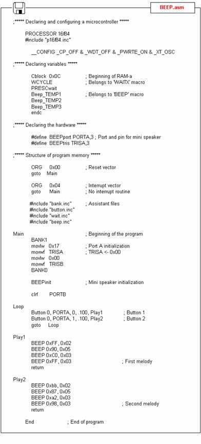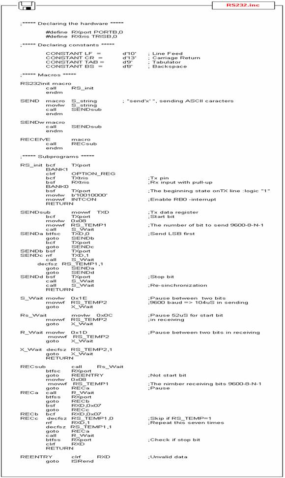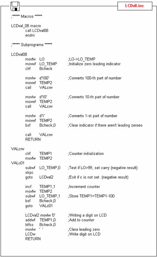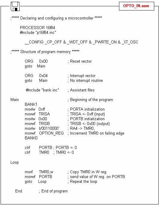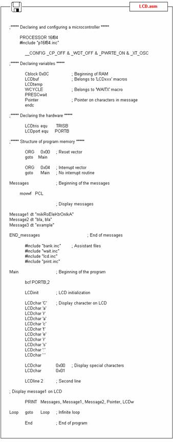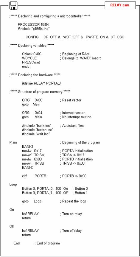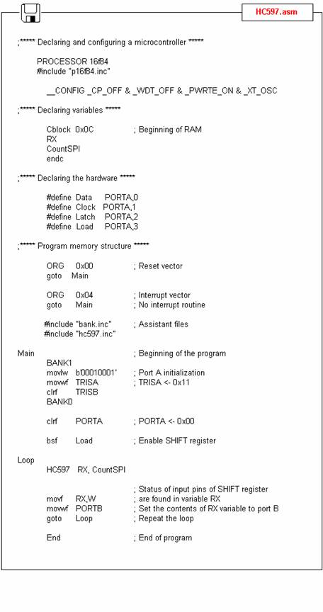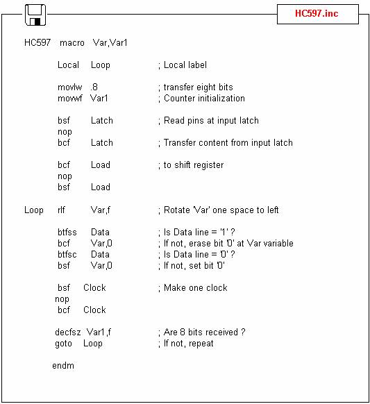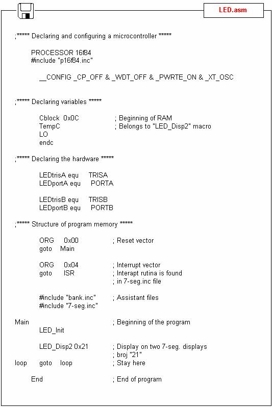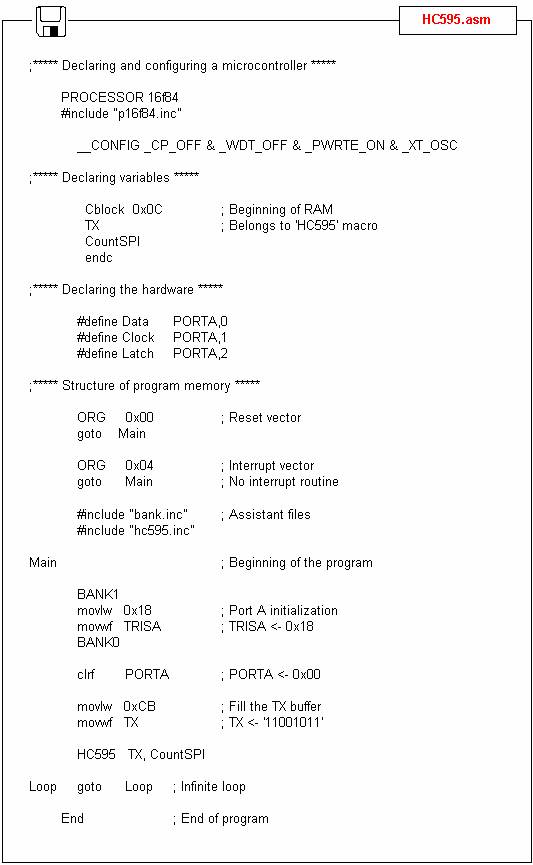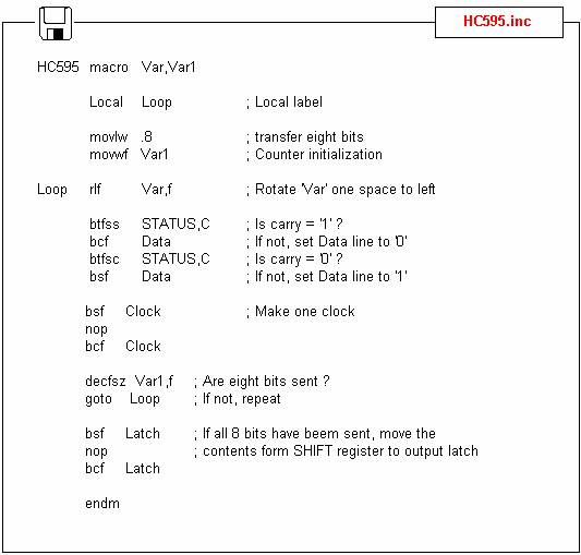 Prima instructiune dupa eticheta Main scrie pozitia unui membru al sirului în registrul W. Executam un salt cu instructiunea call la eticheta sirului unde pozitia membrului sirului este adunata la valoarea PC (Program Counter): PCL = PCL + W. În continuare avem în program counter o adresa a instructiunii retlw cu membrul dorit al sirului. În momentul în care aceasta instructiune este executata, membrul sirului va fi în registrul W, si adresa instructiunii care va fi executata dupa instructiunea call va fi în program counter. Eticheta end este o metoda eleganta de a marca adresa la care sirul se termina.