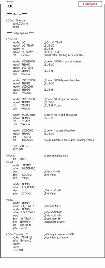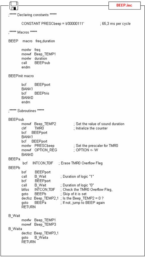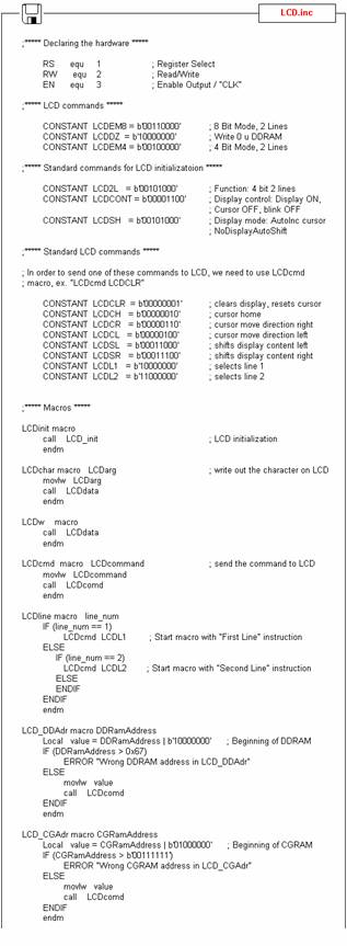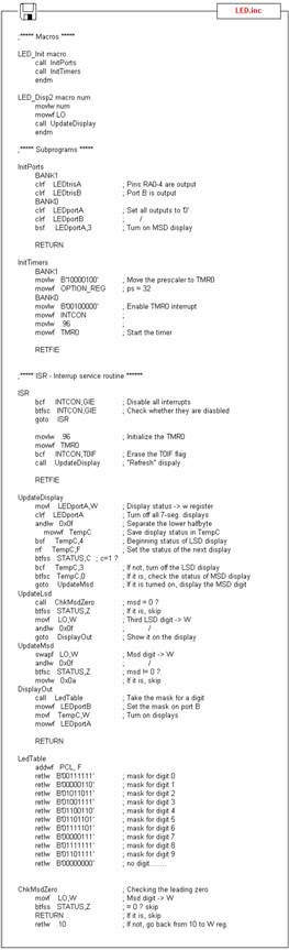 Fisierul Wait.inc contine doua macrouri: WAIT si WAITx. Prin intermediul acestor macrouri este posibil sa repartizam întârzieri de timp în intervale variate. Amândoua macrouri folosesc depasirea contorului TMR0 ca un interval de timp de baza. Prin schimbarea prescaler-ului putem schimba lungimea intervalului depasirii contorului TMR0.