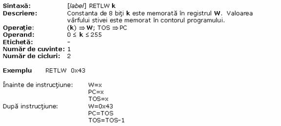 A.31 RETLW Întoarcere dintr-un subprogram cu constanta în W