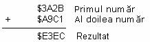 Trebuie sa adaugam cifrele corespunzatoare ale numarului; si, daca suma lor este mai mare ca 16, trebie sa scriem numarul '0' acolo. Valoarea peste 16 trebuie adunata urmatoarelor doua cifre mai mari în valoare. Verificând, obtinem 14891 ca prim numar, si al doilea este 43457. Suma lor este 58348, care este numarul $E3EC când este transferat în sistemul numeric zecimal. Scaderea este un proces identic celor doua sisteme numerice anterioare. Daca numarul pe care îl scadem este mai mic, împrumutam din urmatorul loc al valorii mai mari.