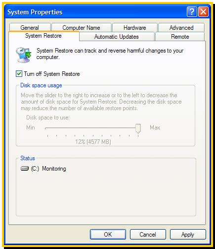 Apoi se alege Apply si OK. Dupa aceste manevre "system restore" este sters si de asemenea si virusul in caz ca a fost deja stocat acolo.