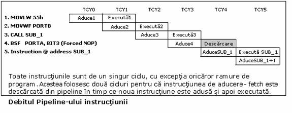 Executarea instructiunii începe prin apelarea unei instructiuni care este urmatoarea în linie. Instructiunea este apelata din memoria program la fiecare Q1 si este scrisa în registrul de instructiuni la Q4. Decodarea si executarea instructiunii sunt facute între urmatoarele cicluri Q1 si Q4. În urmatoarea diagrama putem vedea relatia dintre ciclul instructiunii si clock-ul oscilatorului (OSC1) ca si aceea a clock-urilor interne Q1-Q4. Contorul de program (PC) retine informatia despre adresa urmatoarei instructiuni.
