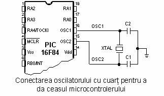 PIC16F84 poate lucra cu patru configuratii diferite de oscilator. Pentru ca configuratiile cu oscilator cu cristal si rezistor-condensator (RC) sunt cele utilizate cel mai frecvent, doar pe ele le vom mentiona aici. Tipul de microcontroler cu oscilator cu cristal este desemnat ca XT, iar microcontrolerul cu perechea rezistor-condensator are desemnarea RC. Aceasta este important pentru ca trebuie sa numiti tipul de oscilator când cumparati un microcontroler.