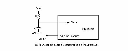 Diagrama de mai sus arata cum este conectat oscilatorul RC la PIC16F84. La valoarea rezistorului mai mica 2.2k, oscilatorul poate deveni instabil, sau oscilatia se poate chiar opri. La valori mari a lui R (ex.1M) oscilatorul devine foarte sensibil la zgomot si umezeala. Se recomanda ca valoarea rezistorului R sa fie între 3 si 100k. Chiar daca oscilatorul va lucra fara un condensator extern (C=0pF), trebuie totusi folosit un condensator de peste 20pF pentru zgomot si stabilitate. Indiferent de ce oscilator este folosit, pentru a obtine un ceas la care sa functioneze microcontrolerul, ceasul trebuie divizat la 4. Un ceas al oscilatorului divizat cu 4 se poate obtine la pinul OSC2/CLKOUT, si poate fi folosit pentru testarea sau sincronizarea altor circuite logice.