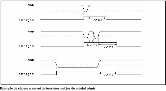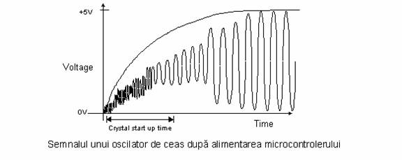 Pentru a preveni ca un asemenea ceas inexact sa influenteze performantele microcontrolerului, trebuie sa tinem microcontrolerul în starea reset pe durata stabilizarii ceasului oscilatorului. Diagrama de mai sus arata o forma tipica de semnal pe care microcontrolerul o primeste de la oscilatorul cu cuart dupa alimentare