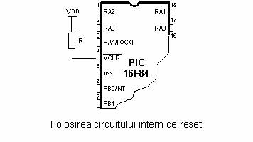 Pentru a preveni ajungerea unui zero logic la pinul MCLR accidental (linia de deasupra înseamna ca resetul este activat de un zero logic), MCLR trebuie sa fie conectat printr-un rezistor la polul pozitiv al sursei de alimentare. Rezistorul trebuie sa fie între 5 si 10k. Acest rezistor a carui functie este de a mentine o anumita linie la starea logica unu ca o prevenire, se numeste o scoatere-pull up.