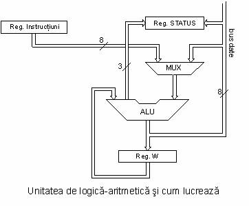 În instructiunile cu doi operanzi, în mod obisnuit un operand este în registrul de lucru (registrul W), iar celalalt este unul din registri sau o constanta. Prin operand întelegem continutul asupra caruia se fac unele operatii, iar un registru este oricare din registrii GPR sau SFR. GPR este o prescurtare de la 'General Purposes Registers'-Registri cu Scopuri Generale, iar SFR de la 'Special Function Registers'-Registri cu Functie Speciala. În instructiunile cu un operand, un operand este fie registrul W fie unul din registri. Pe lânga operatiile aritmetice si logice, ALU controleaza bitii de stare (biti gasiti în registrul STATUS). Executarea unor instructiuni afecteaza bitii de stare, de care depinde rezultatul însusi. Depinzând de ce instructiune este executata, ALU poate afecta valorile bitilor Carry (C), Digit Carry (DC), si Zero (Z) în registrul STATUS.
