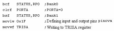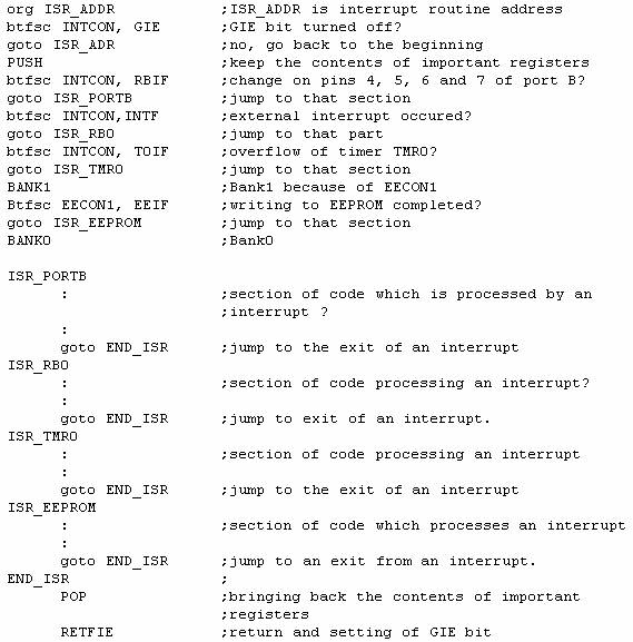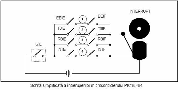 Exemplul de mai sus arata initializarea unei întreruperi externe la pinul RB0 al microcontrolerului. Unde se vede unu setat, înseamna ca întreruperea este permisa. Producerea altor întreruperi nu este permisa, si toate întreruperile împreuna sunt interzise pâna ce bitul GIE este tinut în unu.