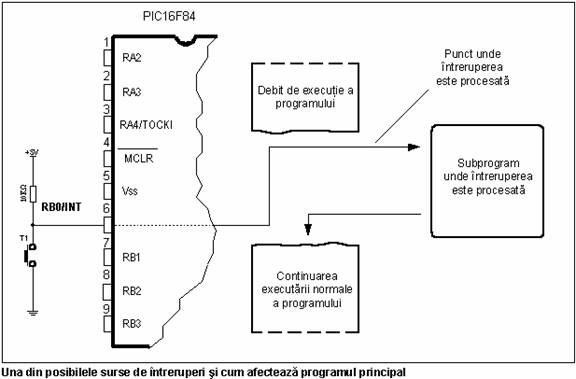 Întreruperea externa la pinul RB0/INT este triggerata de frontul crescator (daca bitul INTEDG=1 în registrul OPTION<6>), sau de frontul descrescator (daca INTEDG=0). Când apare semnalul corect la pinul INT, bitul INTF este setat la registrul INTCON. Bitul INTF (INTCON<1>) trebuie resetat în rutina de întrerupere, asa ca întreruperea sa nu aiba loc din nou în timpul întoarcerii la programul principal. Acesta este un pas important al programului pe care programatorul nu trebuie sa-l uite, sau programul va merge constant în rutina de întrerupere. Întreruperea poate fi închisa prin resetarea bitului de control INTE (INTCON<4>).