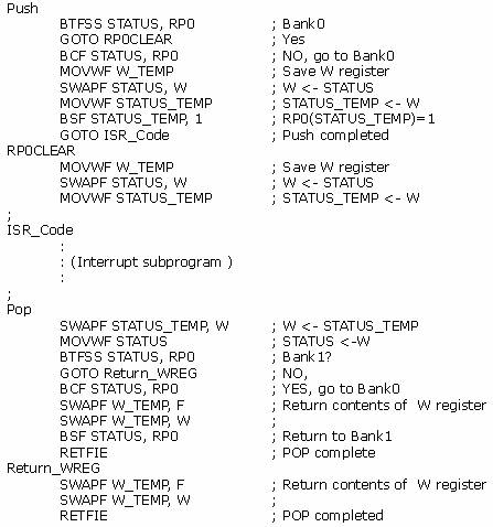 Datorita simplitatii si folosirii frecvente, aceste parti ale programului pot fi facute ca macro-uri. Conceptul unui Macro este explicat în "Limbaj de asamblare program". În urmatorul exemplu, continuturile registrilor W si STATUS sunt memorate în variabilele W_TEMP si STATUS_TEMP înainte de rutina de întrerupere. La începutul rutinei PUSH trebuie sa verificam bancul selectat în prezent pentru ca W_TEMP and STATUS_TEMP nu se gasesc în bancul 0. Pentru schimbul de date între acesti registri, instructiunea SWAPF se foloseste în loc de MOVF pentru ca nu afecteaza starea bitilor registrului STATUS.