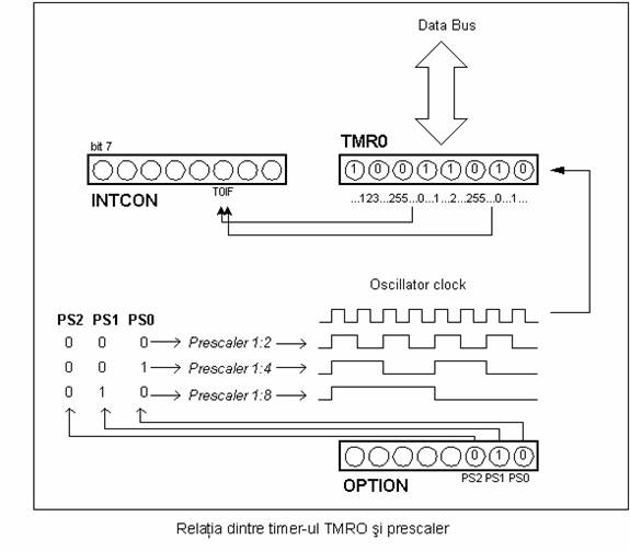 Prescalerul este acordat cu timer-ul TMRO, sau cu timer-ul watchdogului prin bitul PSA în registrul OPTION. stergând bitul PSA, prescalerul va fi acordat cu timer-ul TMRO. Când prescalerul este acordat cu timer-ul TMRO, toate instructiunile de scriere în registrul TMRO (CLRF TMR0, MOVWF TMR0, BSF TMR0,...) vor sterge prescalerul. Când prescalerul este asignat timerului watchdog, numai instructiunea CLRWDT va sterge prescalerul si timer-ul watchdog în acelasi timp. Schimbarea prescalerului este completa sub controlul programatorului, si poate fi schimbat în timp ce se ruleaza programul.